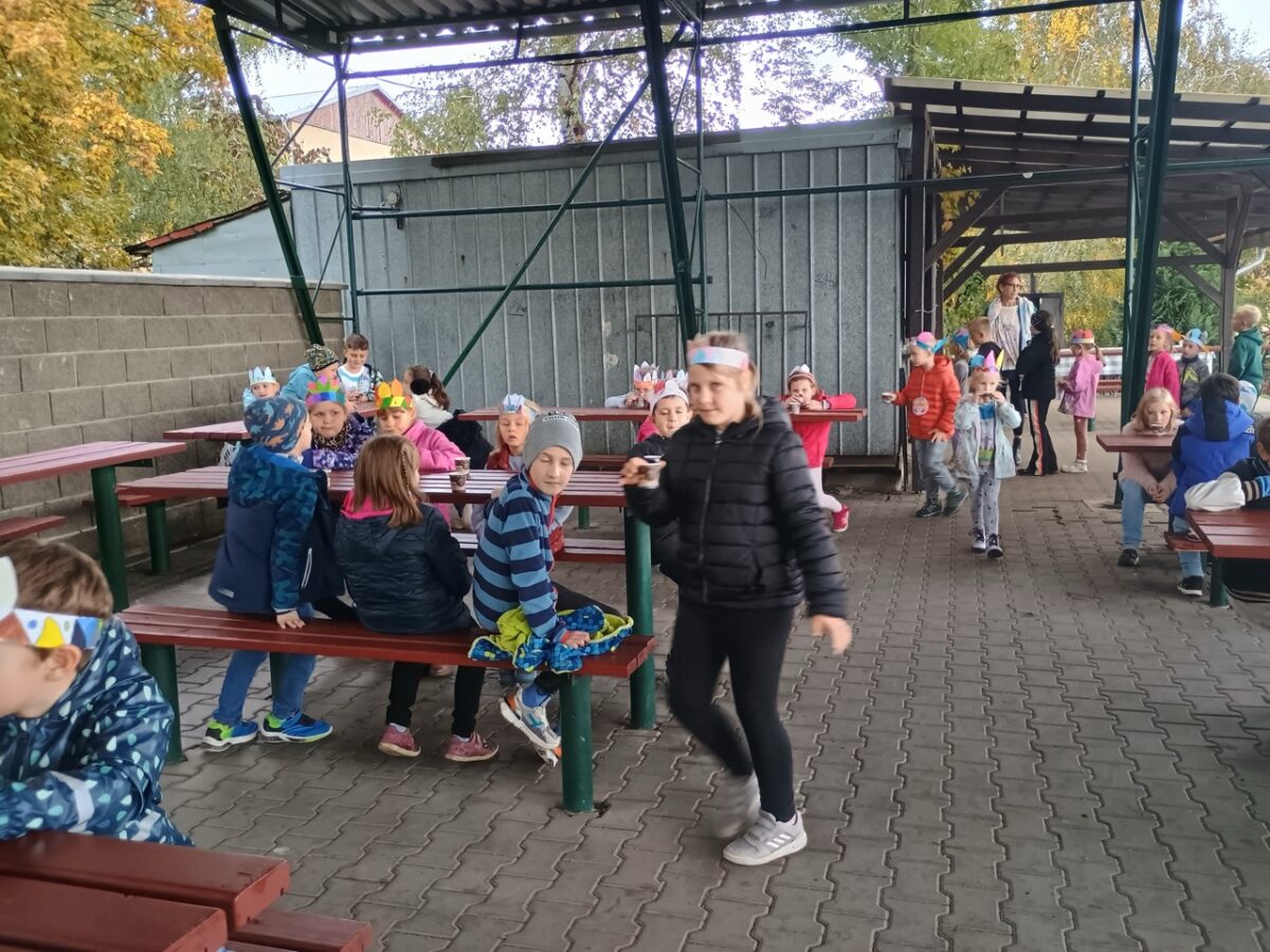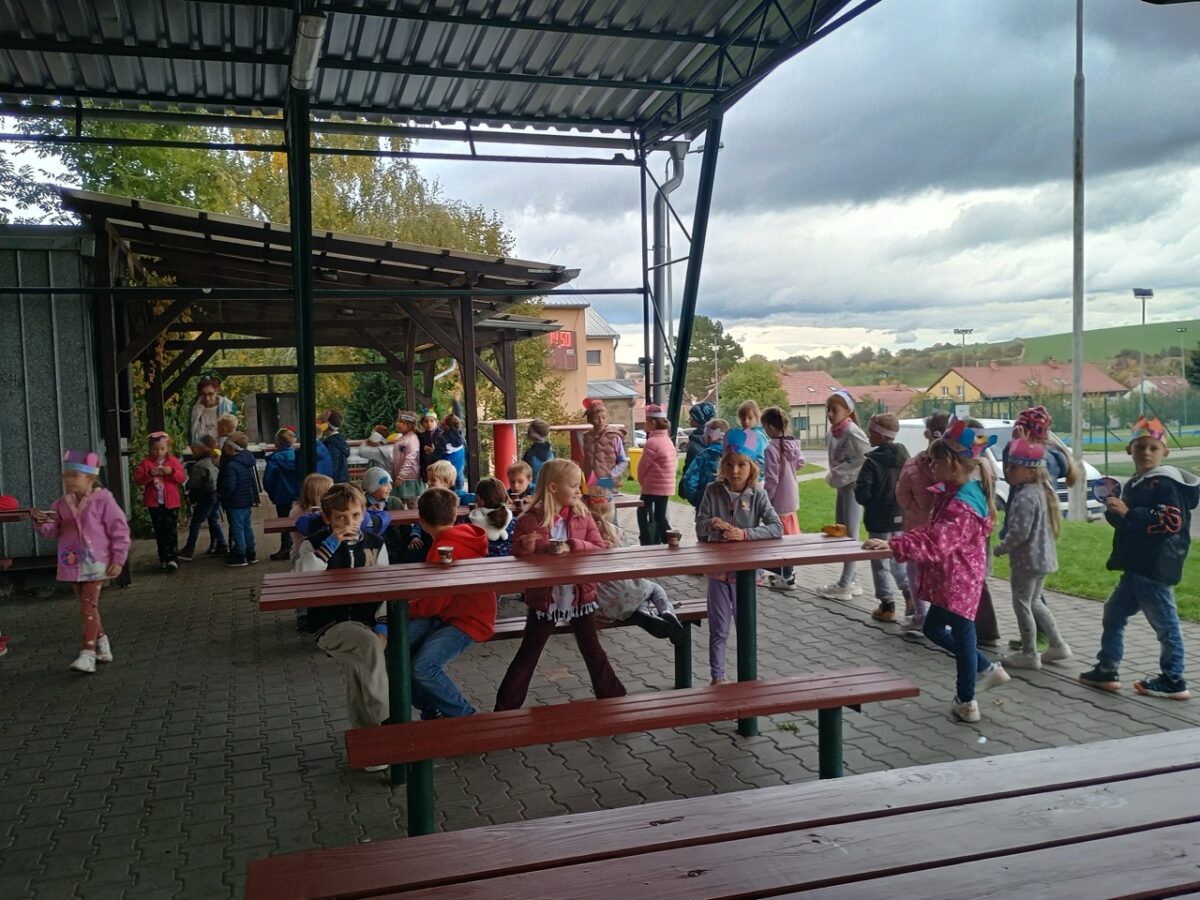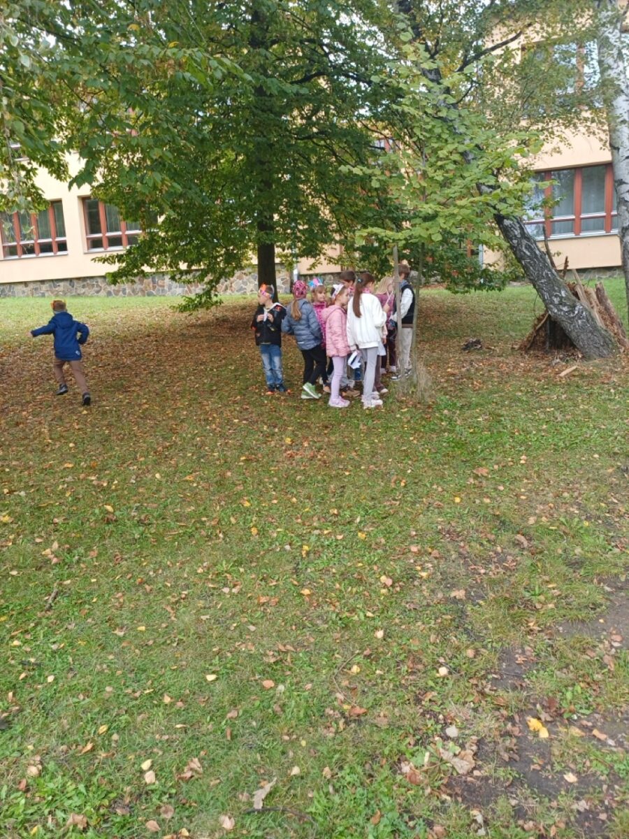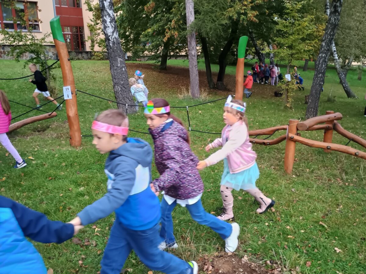 Nechyběla také cesta za indiánským pokladem. Skupinky děti musely odpovědět na otázky, kdy je správná odpověď zavedla na další stanoviště a nakonec k bedně s pokladem. Ha, v bedně byl jen vzkaz, že podklad bílé tváře ukryly přímo v třídách naší družiny. Žádné rozladění se nekonalo, protože nás mile překvapil venku servírovaný čaj s indiánským kořením, který všem luštitelům přišel v pošmourný vhod.