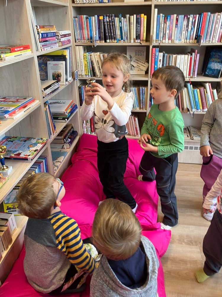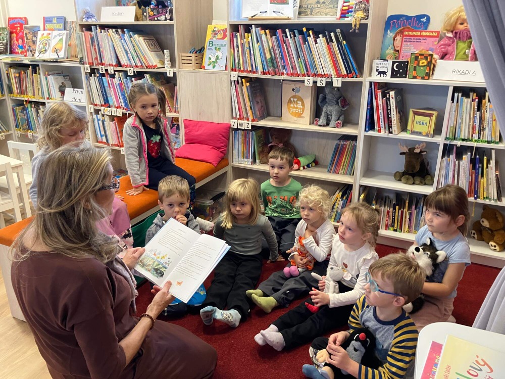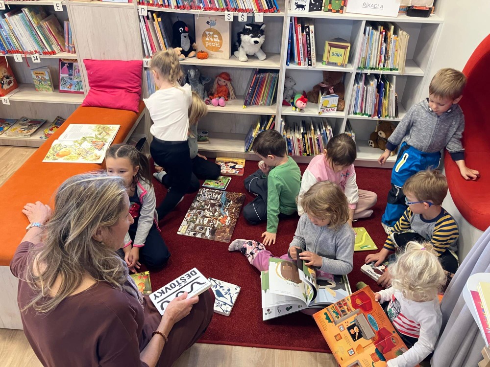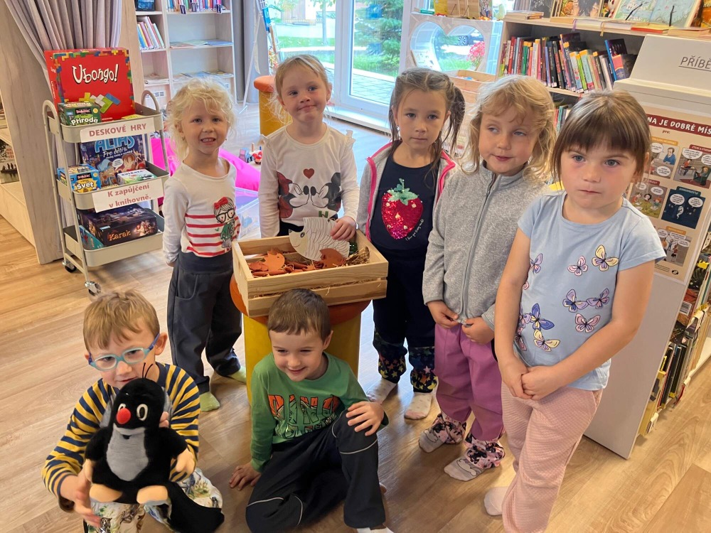 První říjnový den jsme v rámci inovativního vzdělávání navštívili s mladšími dětmi místní knihovnu a prožili tam dopoledne plné nových zážitků, překvapení a tradičních činností v netradičním prostředí. Děti si s paní knihovnicí hned padly do oka, a tak se i ti méně odvážní bez váhání pustili do hledání ježků v dětských knihách, vyslechli si pohádku a protáhli si těla při říkadle o ježkovi. Společně jsme objevili ježčí pelíšek plný malých ježčátek a jejich ustaranou maminku, kterým děti pomohly naplnit prázdná bříška. Velkou výzvou se stal hlavolam„ Ježek v kleci“. Děti si užily všeho, co jim knihovna nabídla a plni dojmů se s pelíškem s ježčí rodinkou, ježkem v kleci a půjčenou knihou vydaly do školky, podělit se o svoje dojmy a zážitky s ostatními kamarády.