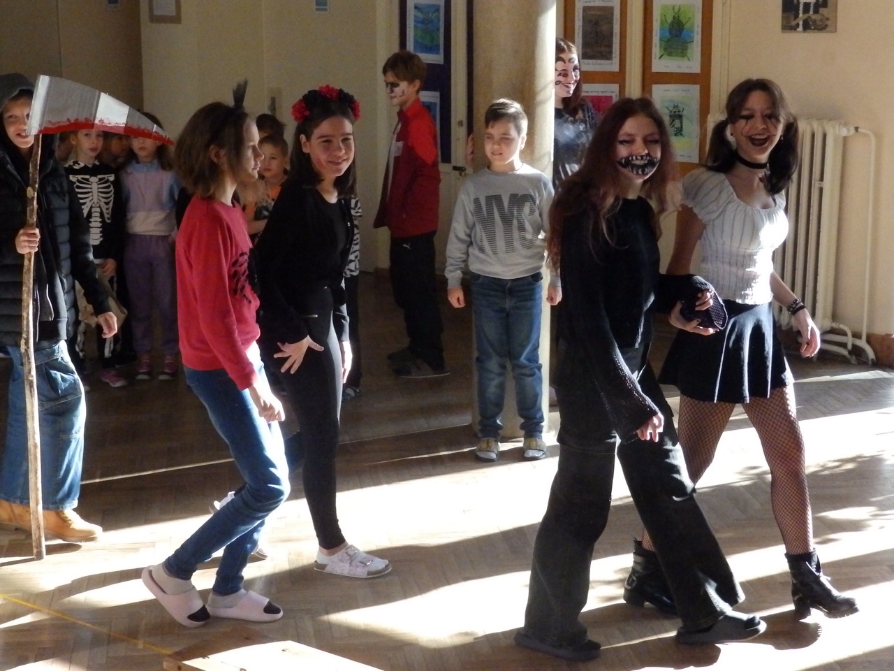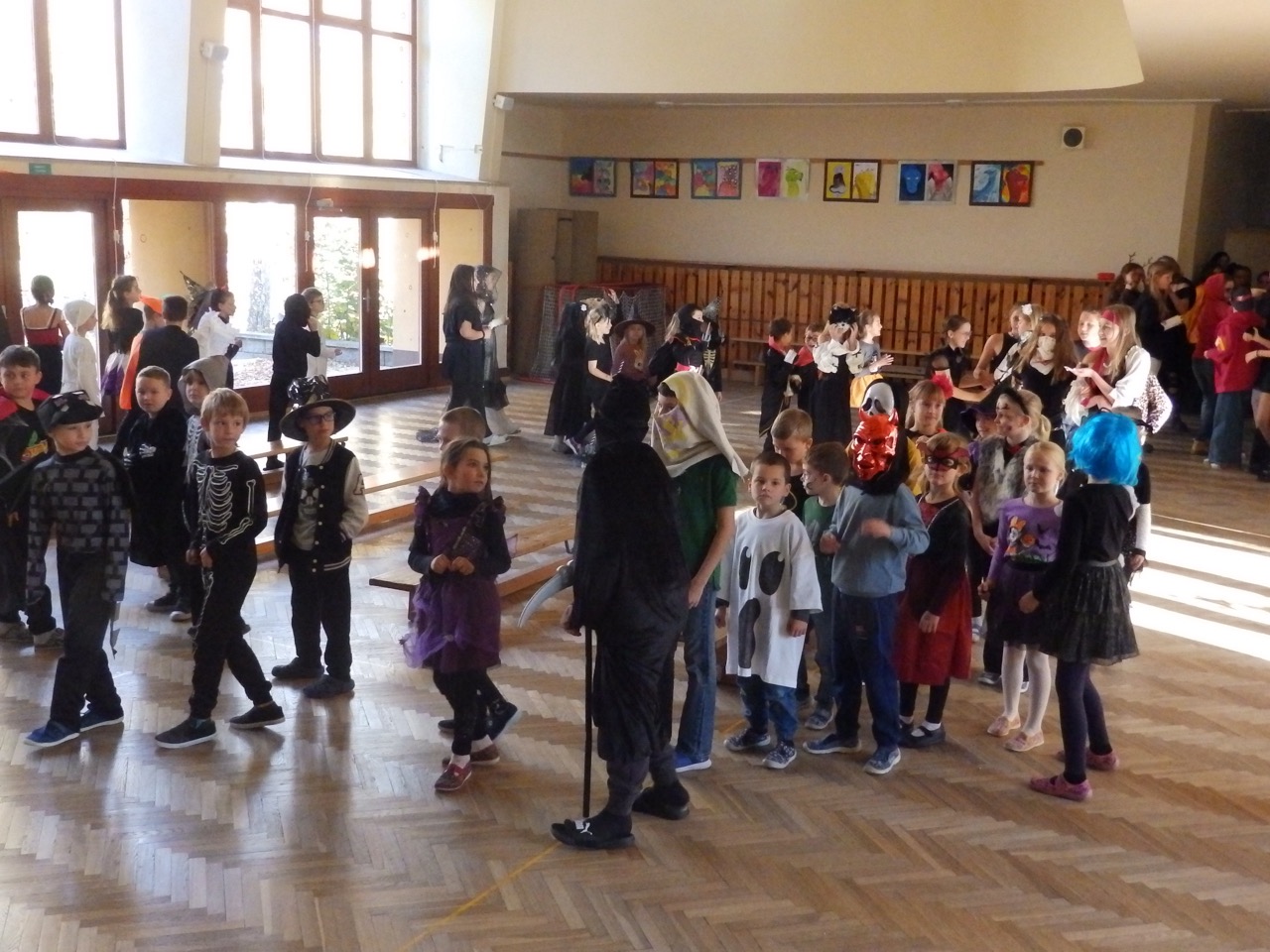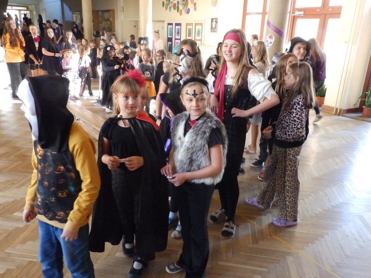 V pátek 31. října v naší škole strašilo – o velké přestávce se totiž náš školní sál proměnil v halloweenský rej masek. Dorazily nejen čarodějnice, ale také ninja, kostlivci, dva školníci, pan Kloboučník, víly, klaun, mumie a další pohádkové a fantasy postavy.