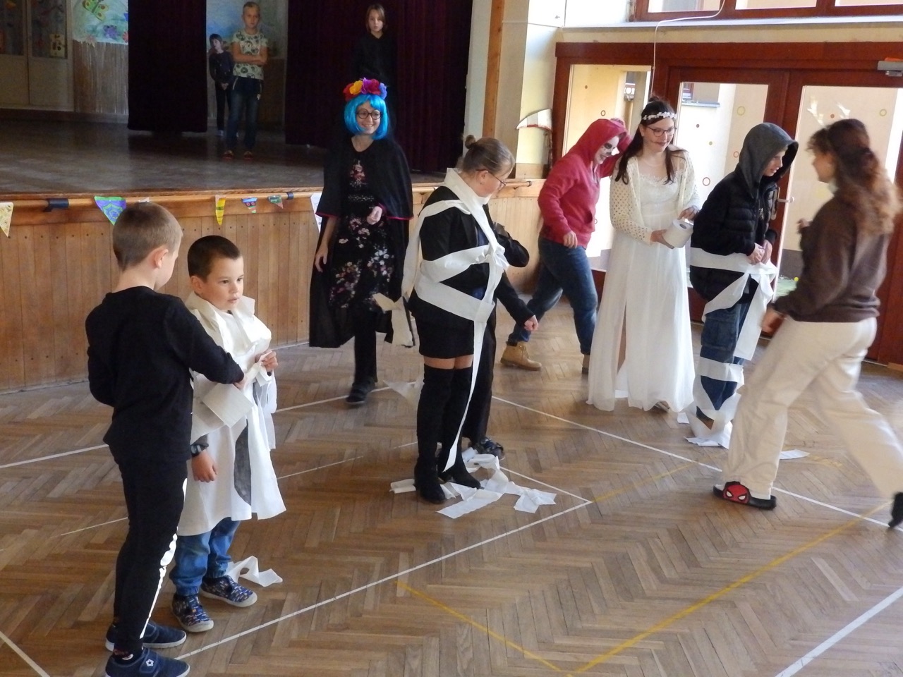 Po úvodním strašidelném defilé se děti pustily do soutěžní štafety s cílem vytvořit ze svých spolužáků co nejvydařenější mumie za pomoci pouze vlastních rukou a roličky toaletního papíru.