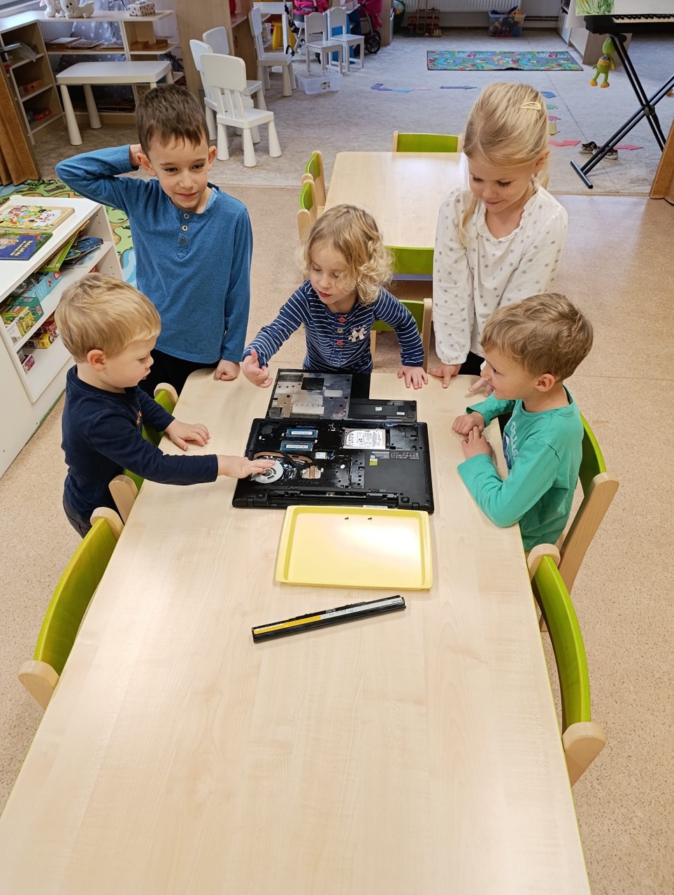 Zahrály si na roboty – pomocí šipek se navzájem „programovaly“. Zkoušely přepisovat písmena, číslice a znaky z klávesnice a zkoumaly, jak vypadá notebook uvnitř. Děti rovněž zkoušely fotografovat věci, které je zaujaly. Z pořízených fotografií jsme si pak udělali výstavku.