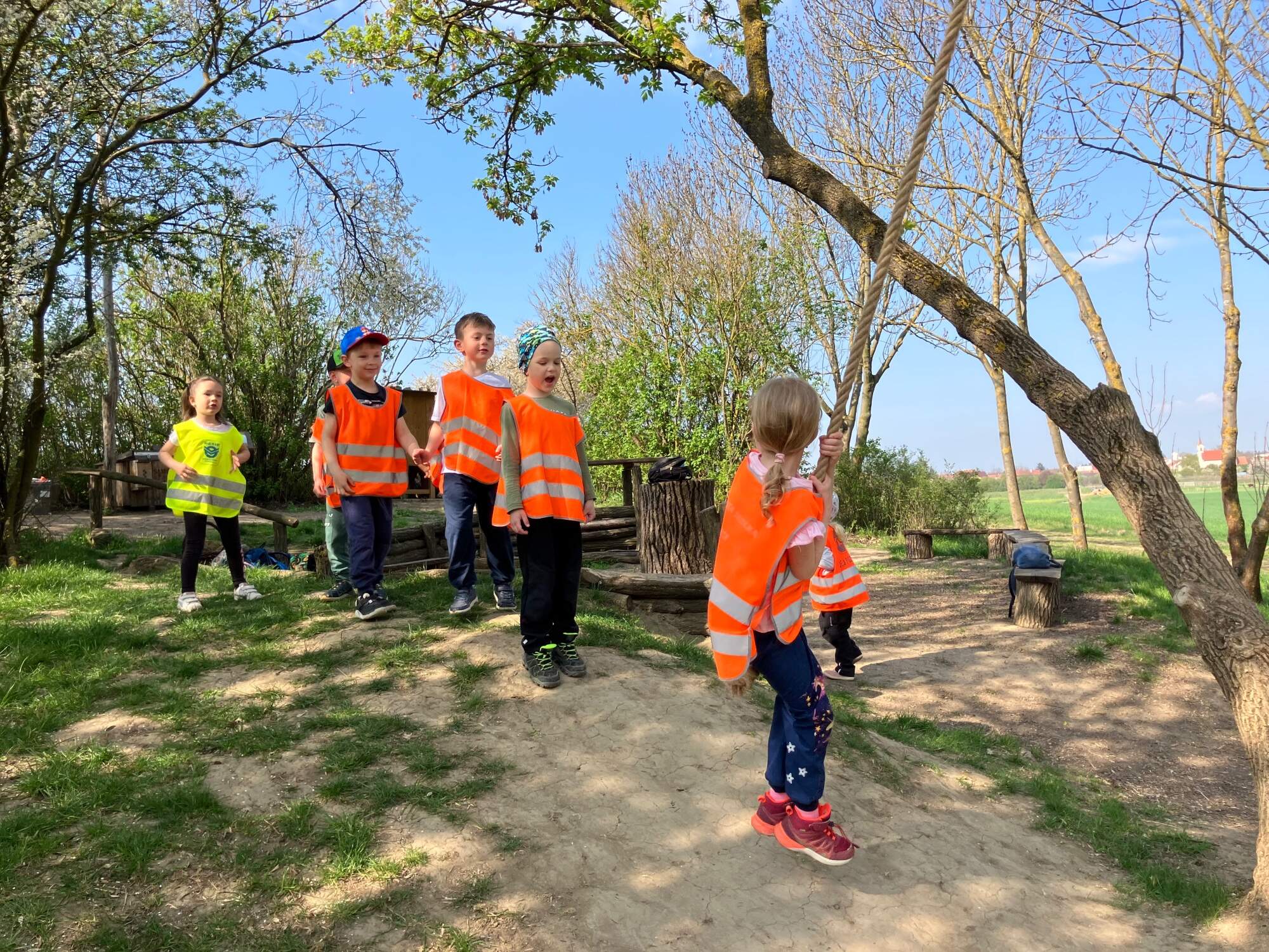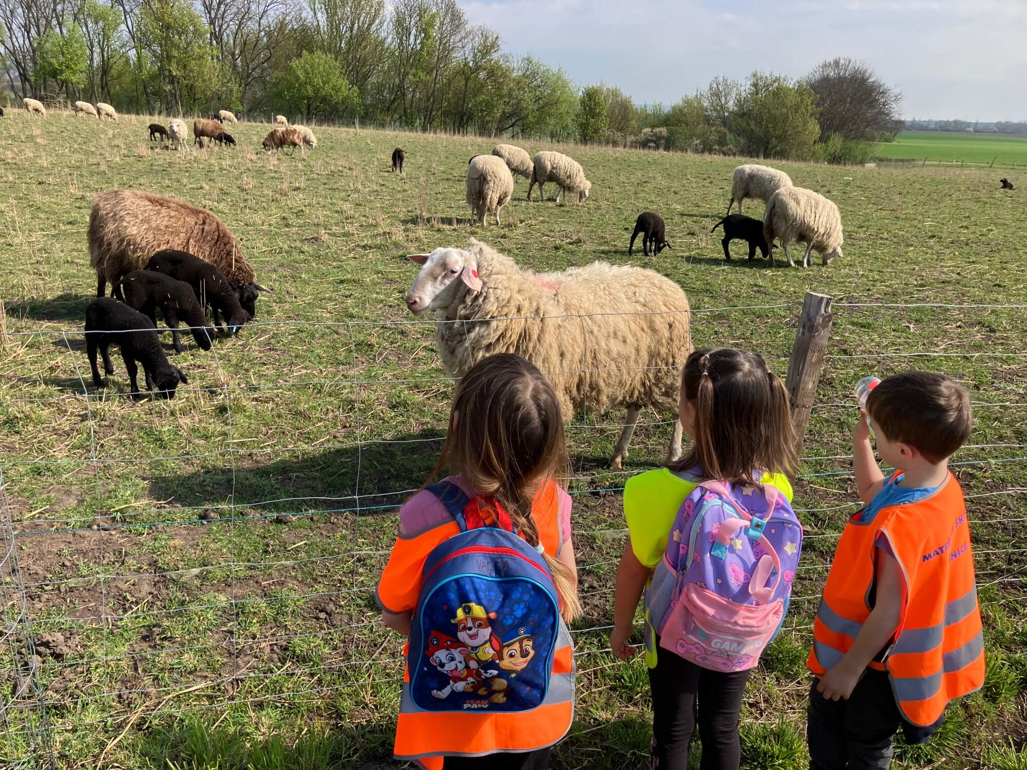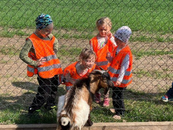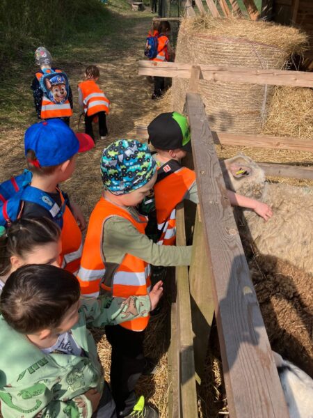 V blízkému lesíku, kam  nás doprovázeli zajíci, jsme nalezli posezení k odpočinku, zavěšená lana na houpání a samozřejmě zase zvířata – kozy a králíky. Ve veliké ohradě o kousek dál se pásly ovce v doprovodu  jehňat. A děti cítily to splynutí s přírodou, chovaly se klidně, ohleduplně, kladly otázky, všímaly si maličkostí, které nám dospělým často uniknou.